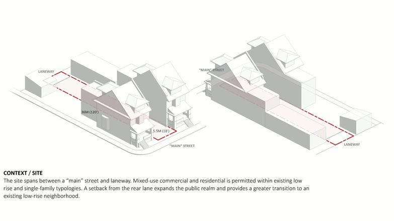 While designed for a specific client and a site with opportune zoning and planning, Hi-Lo Hybrid addresses a prevailing narrow-lot condition along Toronto's main streets. Despite the demand for increased density and housing options along these existing transit and mixed-use corridors, they remain largely underdeveloped, including an estimated 250km of single-family homes, reinforced by low-rise residential zoning and planning. Outdated zoning and current planning policies limit the range of infill opportunities, driving homogenous stacked townhouse forms, as well as outsized mid-rise developments and retail spaces requiring long-term lot assembly. Over time, these development models become further entrenched. Hi-Lo Hybrid demonstrates a modest yet robust alternative.